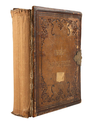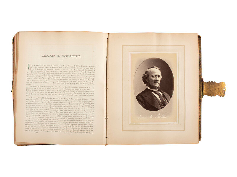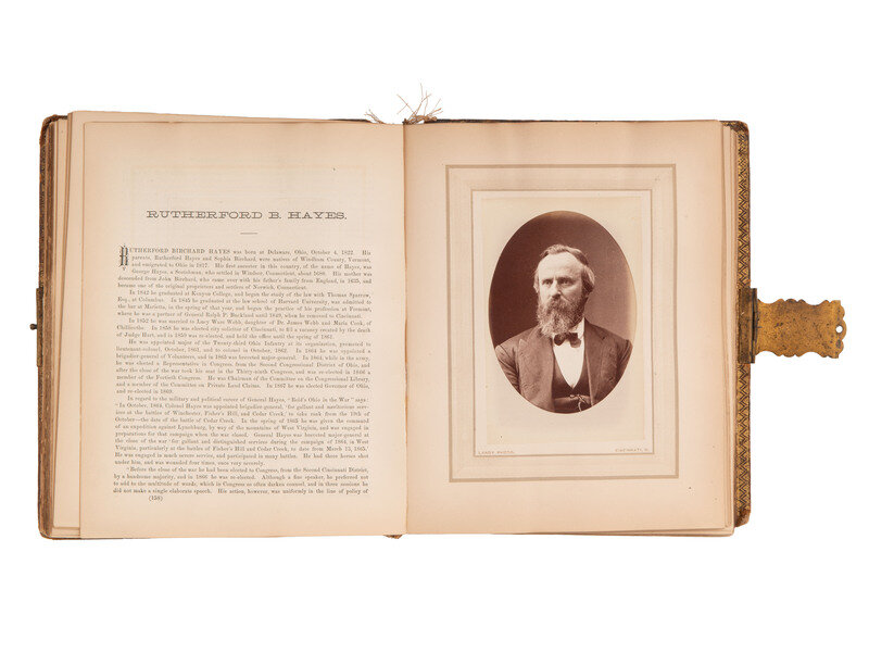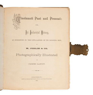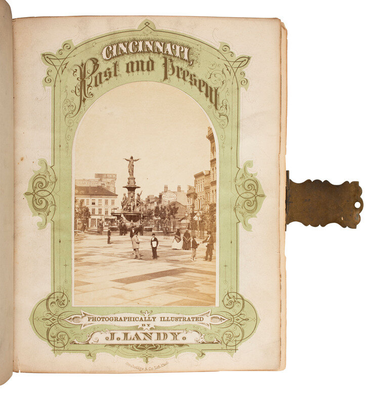 M. JOBLIN & CO. and LANDY, James, photographer. Cincinnati Past and Present: or, Its Industrial History, as Exhibited in the Life-Labors of its Leading Men...Photographically Illustrated by Lames Landy. Cincinnati, OH: Elm Street Printing Co., 1872. 8vo, leather, "Cincinnati Past and Present" in gilt on cover. Illustrated with tipped in albumen photographs. Frontis of Tyler-Davidson fountain; remainder illustrated with portraits of approx. 124 of Cincinnati's prominent citizens of mid-19th century. Subjects include Hayes (Rutherford B.), Este, Gano, Whetstone, Torrence, Taft (Alphonso), Eggleston, and Mitchell. Appears to be incomplete, lacking a few plates.