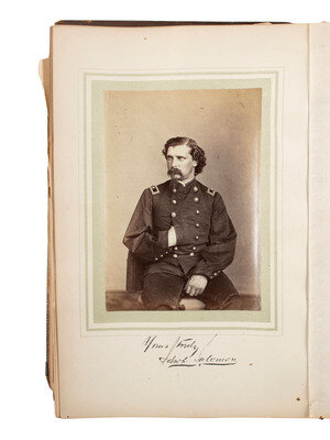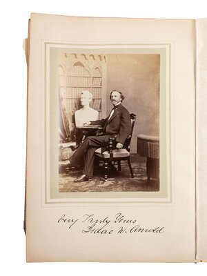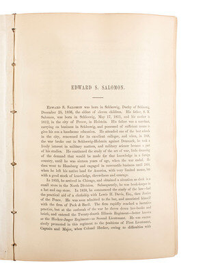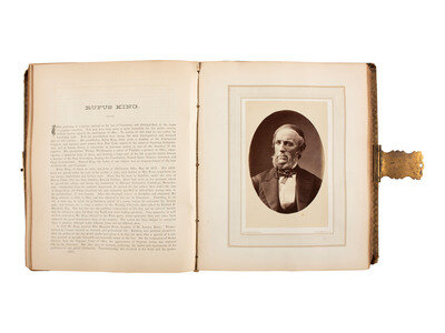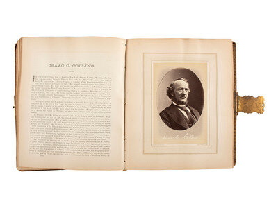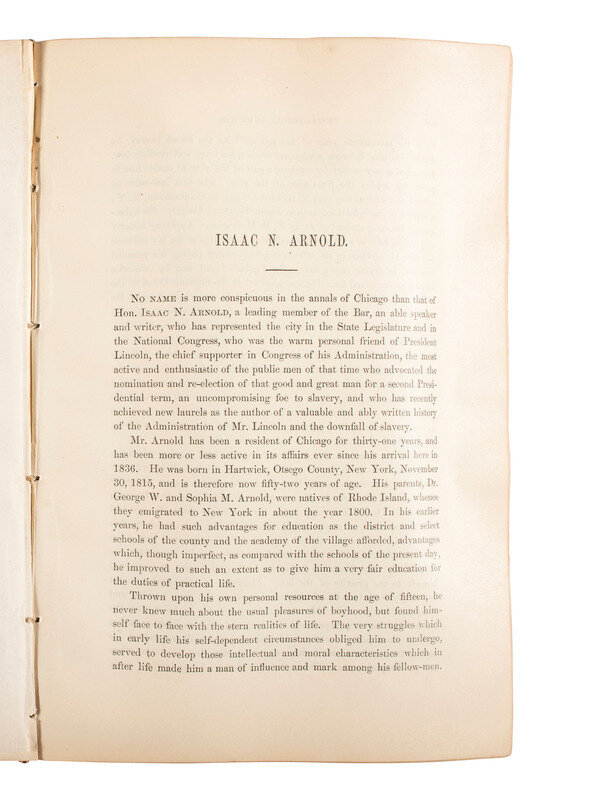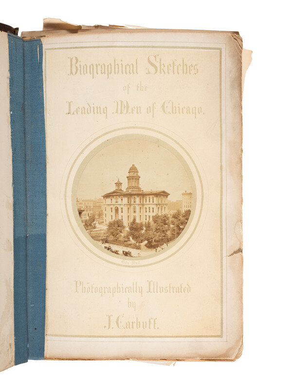 [With:] [George P. UPTON and Elias COLBERT]. CARBUTT, J., photographer. Biographical Sketches of the Leading Men of Chicago. Photographically Illustrated by John Carbutt. [Chicago: Wilson & St. Clair, 1868]. 8vo, leather, "Biographical Sketches / Illustrated" in gilt on spine. Illustrated with tipped in albumen photographs accompanied by facsimile signature below each portrait. Frontis of City Hall; remainder illustrated with portraits of approx. 94 of Chicago's prominent citizens of the the mid-19th century. Subjects include politicians, abolitionists, and military figures such as Felsenthal, Greenbaum, Salomon, and Volk. Appears to be incomplete, lacking a few plates. Scarce pre–Fire imprint and an early work on American portrait photography.