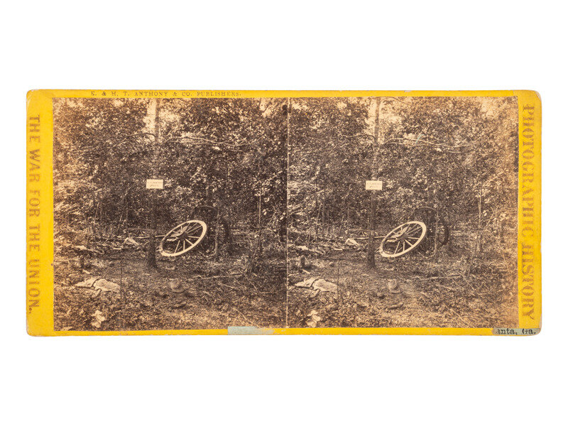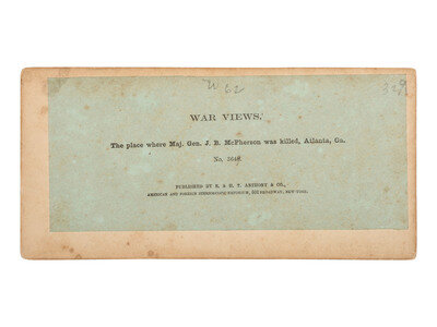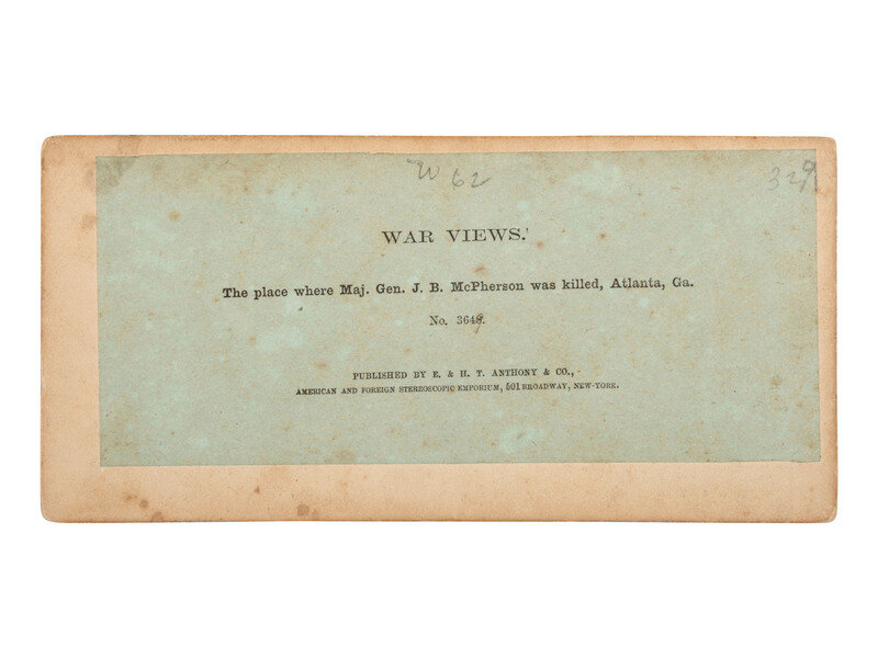 Stereoview on yellow mount with publisher's imprint to upper margin and series title "The War for the Union / Photographic History" to right and left (minor toning, some soiling and residue to print; mount with soiling and wear). Affixed paper label on verso includes image number "3648" and title "The place where Maj. Gen. J. B. McPherson was killed, Atlanta, Ga."