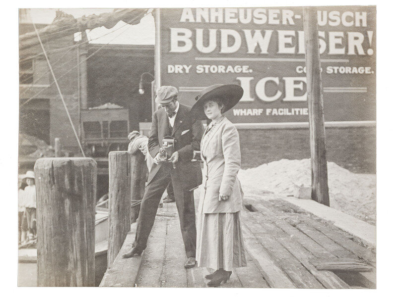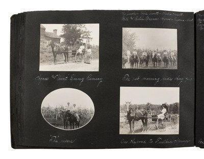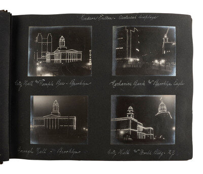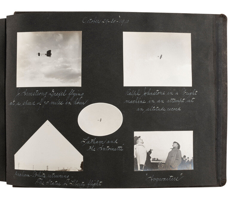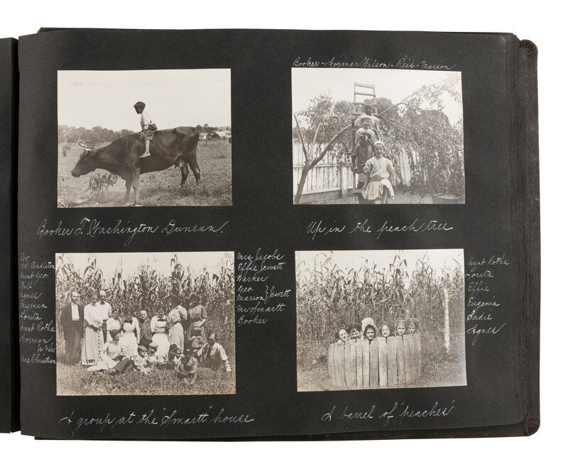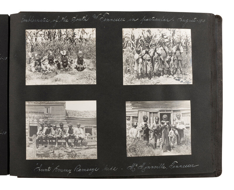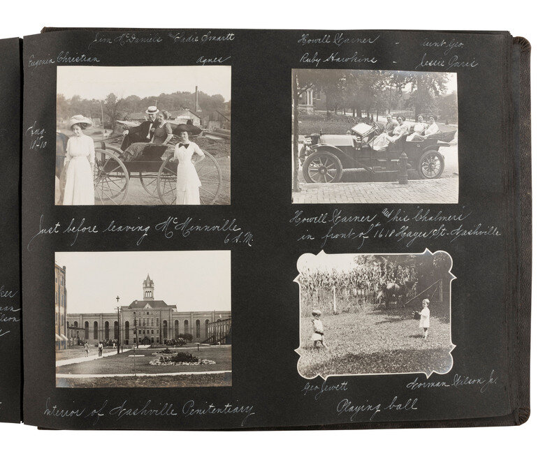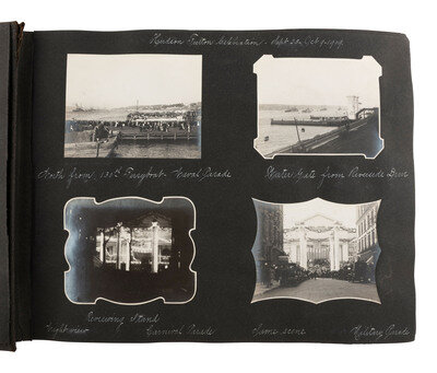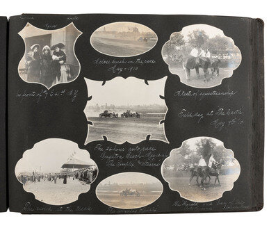 Highlighted scenes and subjects include: Multiple views of the Hudson Fulton Celebration, 25 September - 9 October 1909, including buildings decorated for the event, the Fleet and naval parade, electrical displays at night, including illumination of the Fleet and structures, such as the Brooklyn Bridge and the Plaza Hotel, parade floats, and more. -- Multiple views of Lake Waramaug in New Preston, Connecticut, including family photos, the Loomarwick Inn and other establishments in the area, and scenic views. -- Multiple images of the 24-hour race at Brighton Beach, New York, August 1909, May 1910, Labor Day 1910. -- Multiple images of people in automobiles, including the "Welch" and the "American." -- Multiple images of Atlantic City, NJ. -- Views of various ships, including an image of a yacht identified as "J.P. Morgan's 'Corsair.'" -- Views of the blizzard in New York City at Christmas, 1909. -- Series of photos of "Field Day at the Castle," in Tarrytown, NY, May 1910, including images of women conducting a "military drill," participating in a "basketball match," and taking part in a carnival and parade. A snapshot of author and poet Ella Wheeler Wilcox is included in this section. -- Snapshot of train arriving, identified as "Roosevelt's return, June 18, '10," at Mineola, Long Island. -- Multiple images of aviators flying at Hempstead Plains, New York, including "Joe Seymour 'up in the air,'" "Captain Baldwin ready to fly." -- A scene of Philadelphia captioned, "Watching the returns of the Jeffries - Johnson fight, July 4, 1910." -- Multiple images of Bay Shore, Long Island. -- Multiple images documenting a journey by rail from Norfolk, VA, to locations throughout North Carolina and Tennessee, with a long visit documented presumably family farm and residence, in McMinnville, Tennessee. Included in the McMinnville photos are multiple images of African Americans. Views include photos of Black children identified as "'Aunt' Emmy Ramsay's kids," at least 4 views of a young African American child identified as "Booker T. Washington Duncan" involved in various activities such as horseback riding and feeding the pigs. -- 3 images of the Nashville Penitentiary, including two views of Black men in striped prison uniforms, one identified as "Dummy," the other showing a group of men marching to supper. -- Multiple views of Asheville, North Carolina, including the Biltmore Estate and scenic locales. -- Multiple images of the Aviation Meet at Belmont Park, October 1910, including views of the crowds and aviators in flight, such as J. Armstrong Drexel, Ralph Johnston in a "Wright machine," Graham White returning from the Statue of Liberty Flight, and Latham and the "Antoinette." -- Multiple images of African American staff. -- And much more.