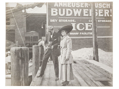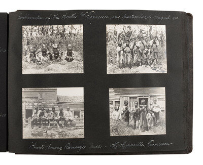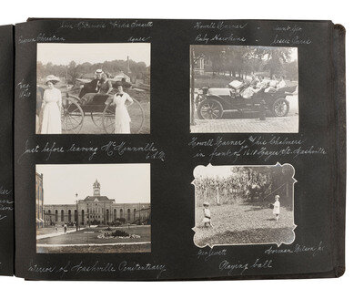 11 x 15 in. album inscribed on front cover, "1909-1910 / Hudson Fulton / Waramaug / Southern Trip." Contains more than 350 silver gelatin photographs, approx. 3 1/2 x 4 1/2 in., or smaller, mounted recto/verso on album pages. Some are cut in unique shapes, and most are accompanied by manuscript captions identifying the location or event. The album appears to document a family's experiences and travels in the Northeastern and Southeastern United States, with many of their journeys made by automobile.