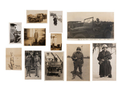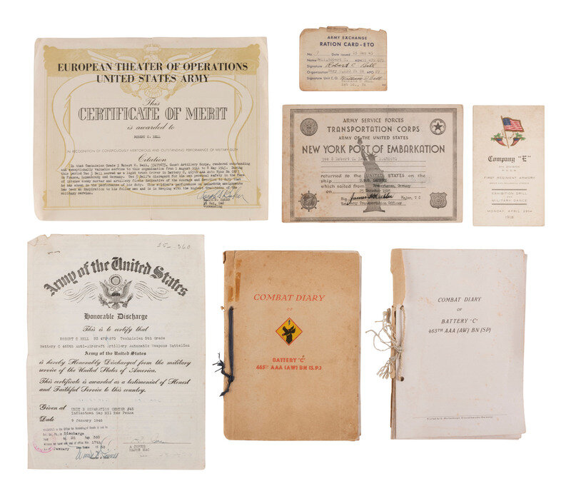[With:] A small group of approx. 25 photographs, documents, and imprints related to Robert Cresson Bell and his US Army service. Documents include an Honorable Discharge, a Certificate of Merit for "meritorious and outstanding performance of military duty" while with Battery C, 465th AAA, an Army Service Forces Transportation Corps document, an Army Exchange Ration card, and a US Army "Separation Qualification Record" that lists his "Civilian Occupation," as a commercial photographer that was "self employed for 13 years as a photographer in Philadelphia." Assorted snapshots of Bell and fellow servicemen in the United States and abroad are also included, as well as a portrait of Bell in uniform with his father, D. Sargent Bell, in South Carolina.