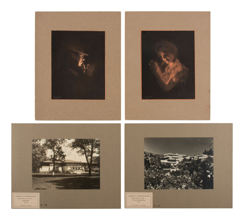[With:] 2 silver gelatin photographs, approx. 6 1/2 x 9 in., on cardstock mounts, with applied labels identifying the scenes as examples of "American Architecture, including the Lovell Health House in Los Angeles, CA, designed by Richard J. Neutra, and the Coonly House in Riverside, IL, designed by Frank Lloyd Wright. Each with ink stamp on verso indicating that the images were supplied and mounted by Richard Lesch, New York. -- 4 prints, including duplicate views of a woman smoking a cigarette and a man smoking a pipe, approx. 9 x 7 in., partially affixed to cardstock mounts, each with "Copyright 1900 by Gay" at lower left of print. -- 3 hand-colored prints of Niagara Falls, approx. 5 3/4 x 9 1/8 in., on cardstock mounts, each titled and copyrighted 1925 in the negative (prints and mounts in poor condition, with soiling, surface wear, and loss).