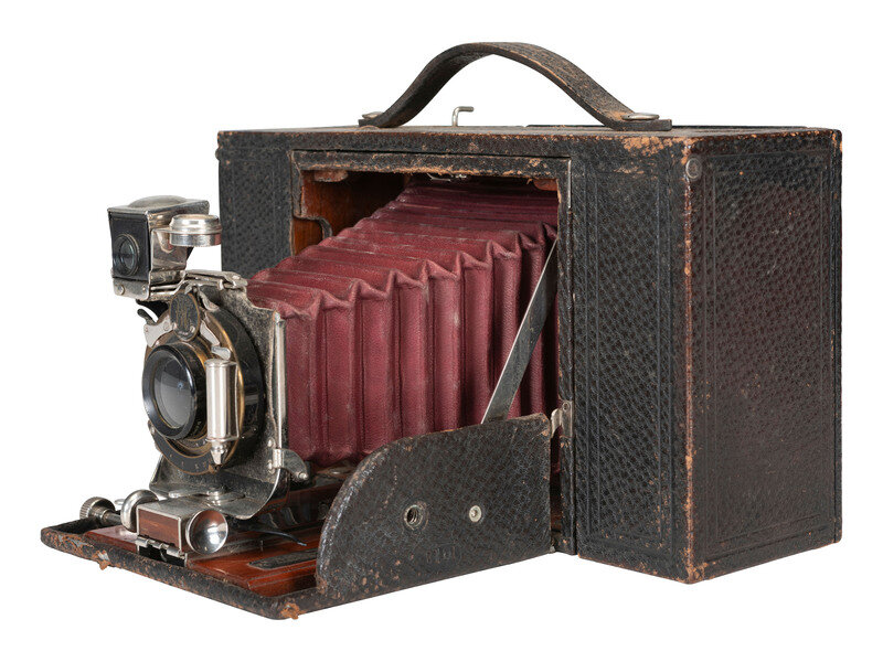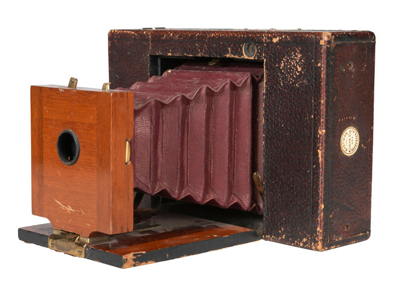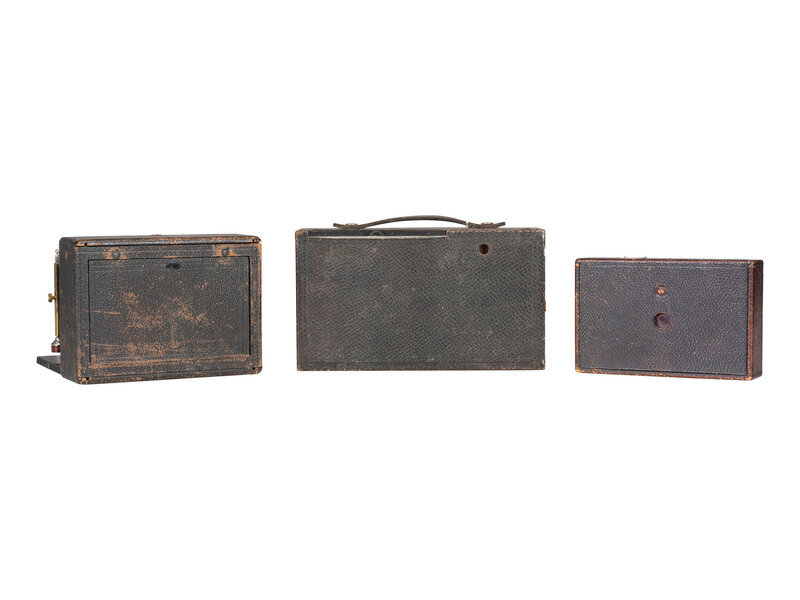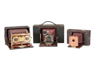 Stereo Solograph camera. 5 1/2 x 7 1/2 x 8 in. leather case on mahogany, red bellows, Wollensak lenses. Ca 1901. -- Kodak No. 2 Folding Bull's-Eye camera. 4 1/2 x 5 1/2 x 7 in. leather case on wood, red bellows. Ca late 1899-1901. -- Screen Focus Kodak camera, No. 4. 5 3/4 x 8 x 10 in. leather case on wood, red bellows. Ca 1904-1910. -- Together, 3 cameras.