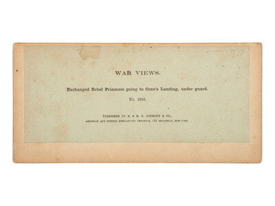 Stereoview on cardstock mount with E. & H. T. Anthony & Co. imprint along upper edge and series title "Photographic History / The War for the Union" to left and right of mount recto. Verso bears printed label featuring view number and title: No. 2695. Exchanged Rebel Prisoners going to Coxe's Landing, under guard.