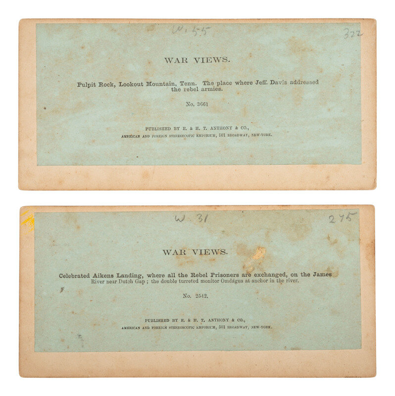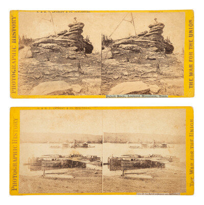 [With:] 2 additional views on cardstock mounts with E. & H. T. Anthony's imprint along upper edge and series title "Photographic History / The War for the Union" to elft and right of mount recto. Versos bear printed labels featuring view numbers and titles including: No. 2542. Celebrated Aikens Landing, where all the Rebel Prisoners are exchanged, on the James River near Dutch Gap; the double turretted monitor Omdagua at anchor in the river. -- No. 3661. Pulpit Rock, Lookout Mountain, Tenn. The place where Jeff. Davis addressed the rebel armies.