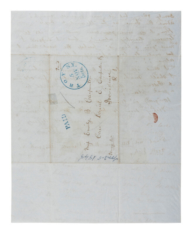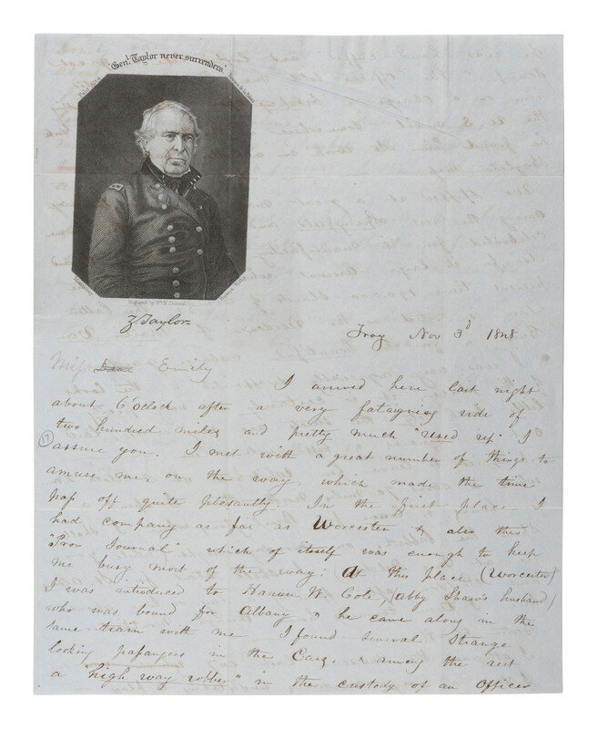 Pictorial campaign lettersheet featuring an engraving of General Zachary Taylor surmounted by "Genl Taylor never surrenders" and at each corner a name of one of Taylor's Mexican War victories: "Palo Alto" / "Resaca de la Palma" / "Monterey" / and "Buena Vista." MILGRAM ZT-3, R-3 (less than 5 known). Letter dated 3 November 1848, four days before the national election.