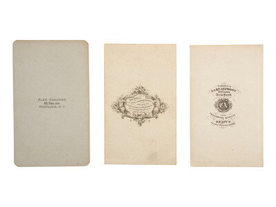 Seated portrait of Chase in a studio next to a table surmounted by an interesting ink well and papers (toning, soiling, and wear to print; mount with significant soiling and some wear). New York: Anthony (Brady). -- Full studio portrait of Chase standing next to a column and resting his hand on the top rail of a wooden chair (some losses to print; wear to mount). New York: Brady. -- Vignetted bust profile portrait of an older Chase (significant toning, light soiling to print; mount with light wear and discoloration). Washington, DC: Gardner. -- Together, 3 CDVs.