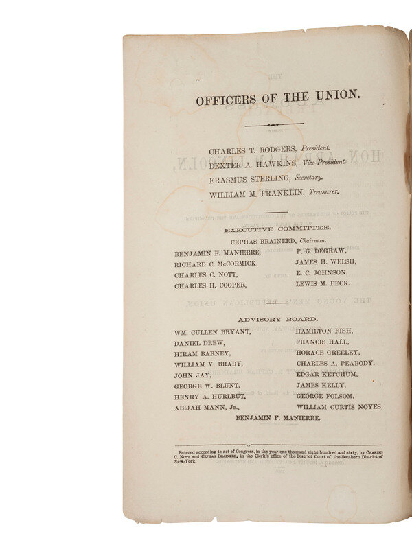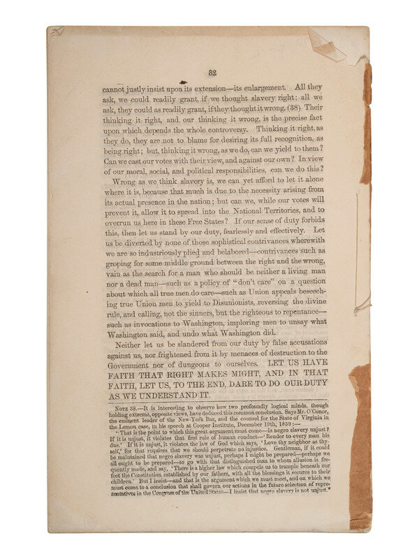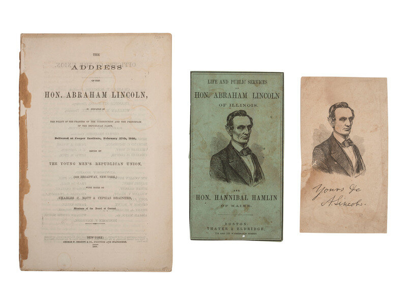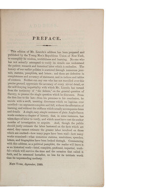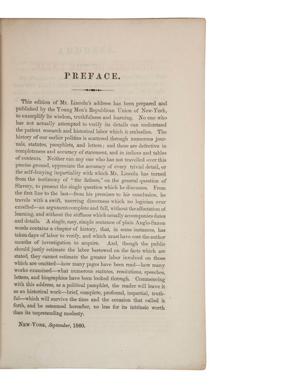 The Address of the Hon. Abraham Lincoln, In Vindication of the Policy of the Framers of the Constitution and the Principles of the Republican Party, Delivered at Cooper Institute, February 27th, 1860, Issued by the Young Men's Republican Union. New York: George F. Nesbitt & Co. Printers and Stationers, 1860. 8vo, 32pp (lacking wrappers, some toning and light creasing, small loss back page). Includes list of the officers of the Young Men's Republican Union and preface by Charles C Nott and Cephas Brainerd dated "New-York, September, 1860."