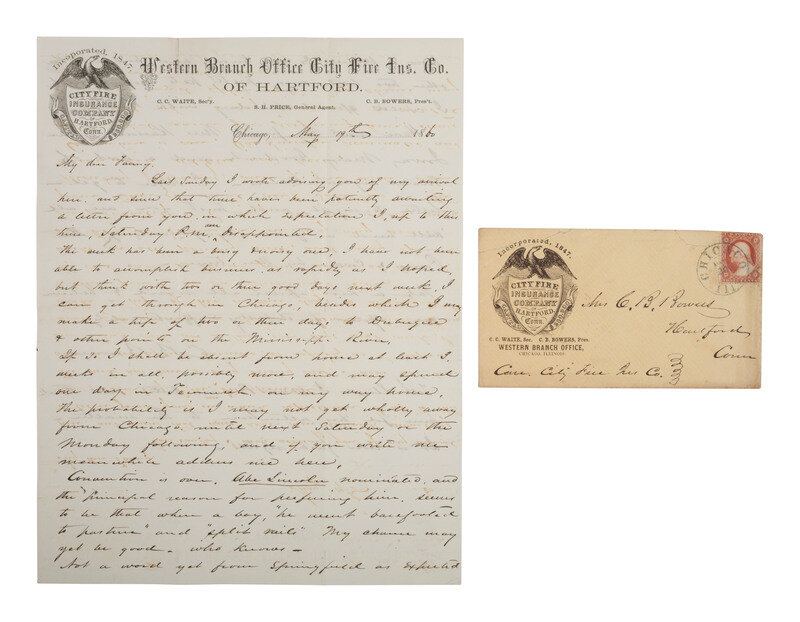 Chicago, [Illinois], 19 May 1860. 2pp, Approx. 8 1/4 x 10 1/2 in. On letterhead of "Western Branch Office City Fire Ins. Co. of Hartford" letterhead. Accompanied by matching cover with 20 May cancellation.