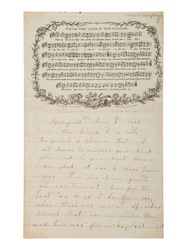 Illustrated lettersheet, 4 1/2 x 7 1/4 in. featuring sheet music for the song While the Lads in the Village, with ornamental floral border. It is possible this song was used as a pro-Lincoln campaign song, especially given a portion of the lyrics promoting honesty and consistency of character: "that my words and my deeds are the same."