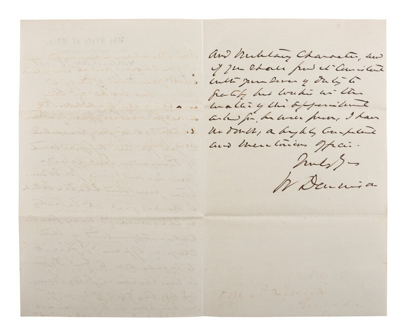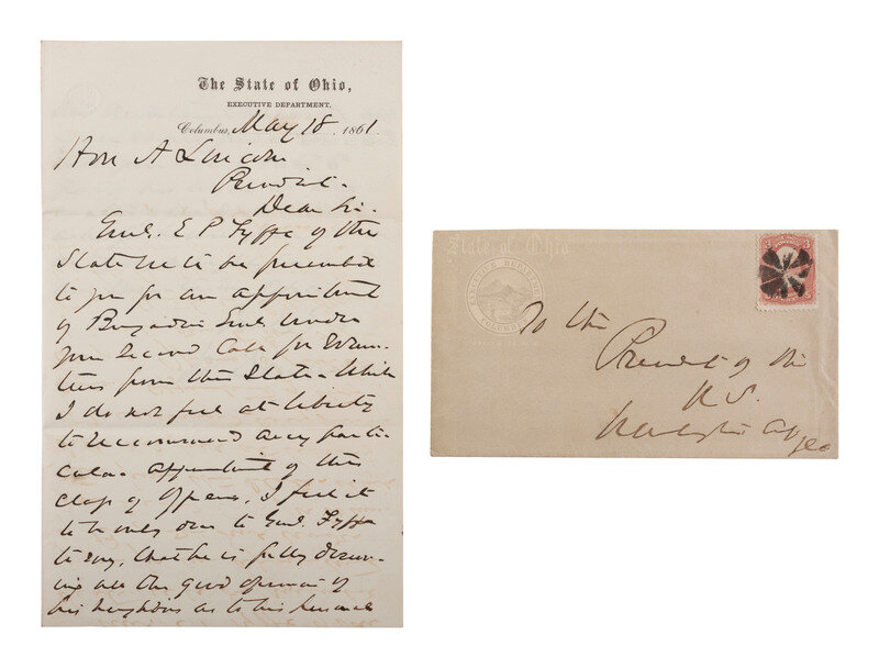 Autograph letter signed ("W. Dennison") as Ohio Governor, to President Abraham Lincoln. Columbus, [Ohio]. 18 May 1861. 2pp, 5 x 8 in. (creasing at folds, light toning). On "The State of Ohio, Executive Department" letterhead. Accompanied by matching cover addressed "To the President of the US / Washington DC."