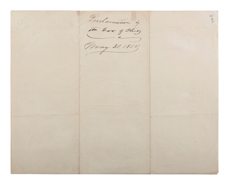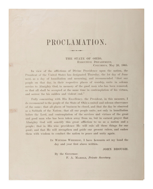 [With:] BROUGH, Governor John (1811-1865). Printed "Proclamation. The State of Ohio, Executive Department, Columbus, May 2d, 1865." Signed in type by John Brough. 1p, bifolium. Docketed on verso "Proclamation by the Gov. of Ohio / May 31 1865."