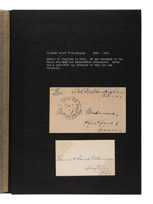 card signed on recto "Clement Laird Vallandigham / Dayton / Ohio" and dated on verso "Jany 25, 1861."Approx. 3 1/4 x 2 in. (light toning). Pencil notation on verso of cover indicates that the card was contained within the cover.
