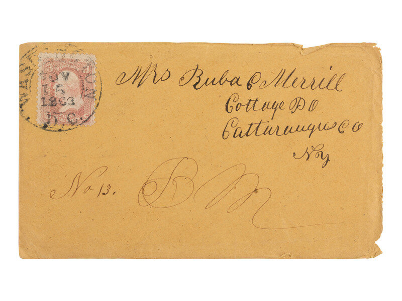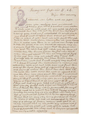 5 x 8 in. illustrated lettersheet featuring "Ab'm Lincoln" bust portrait in purple at top left. MILGRAM AL-138, later printed in black for the 1864 campaign and also adopted for mourning designs following Lincoln's assassination. Lettersheet contains soldier's letter to his wife describing, in part, the countryside near Thoroughfare Gap and ongoing wartime activity in the region, "Thoroughfare Gap, [VA], Nov 11. [18]62." 4pp, with accompanying cover addressed to "Mrs. Buba C Merrill" in Cattaraugus County, New York. Though unsigned, the author appears to be Mr. Barzilla Merrill (1818-1863) of the 154th New York Infantry.