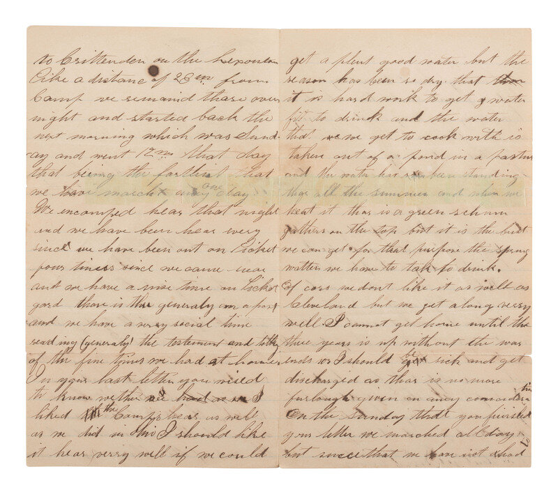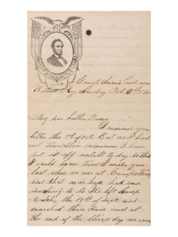 4pp, bifolium, unsigned, soldier's letter appears incomplete (small ears, adhesive repairs). "Camp Snow's Pond near Walton, Ky. Sunday Oct. 5th 186[?]." Soldier describes general camp life, marching, and other details of his regiment.