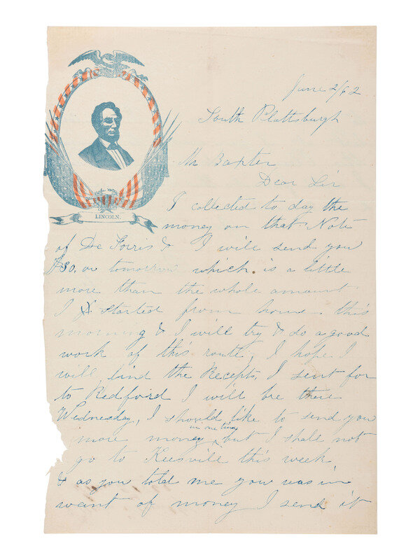 Brief letter below sent from "South Plattsburgh," 2 June 1862, regarding business and money matters.