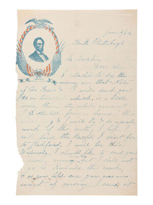 5 x 8 in. illustrated lettersheet (loss along left edge line affecting small amount of text and illustration, creasing at folds, light toning) featuring a red and blue patriotic design, constituting a three-quarter portrait of Lincoln with a beard surrounded by eagle, flags and "Lincoln" ribbon below. MILGRAM AL-135.