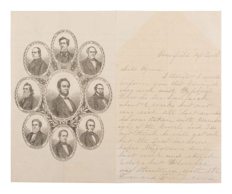 Illustrated lettersheet in black showing Abraham Lincoln's cabinet, ca 1863. Oval portrait of Lincoln at center surrounded by smaller oval portraits of eight cabinet members. On 2pp, bifolium letter. Greenfield, Massachusetts. 15 December [1863?].