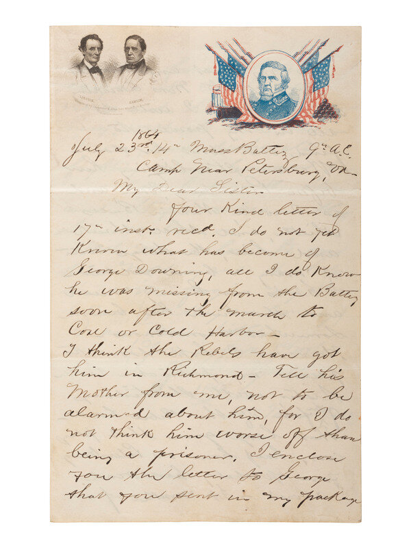 BRADLEE, Samuel J. Autograph letter signed (“1st Lieut. Samuel J. Bradlee”) to his sister while serving with the 14th Massachusetts Battery. “Mass Battery 9 A.C. Camp Near Petersburg, Va,” 23 July 1864. 3pp, 5 x 8 in. (creasing at folds, light toning, penciled notation on 4th page). On illustrated lettersheet featuring an engraved design of Lincoln and Hamlin in black, a common first campaign type which was converted into a patriotic lettersheet by the addition of General Winfield Scott's portrait with patriotic symbols in red and blue. A rare composite type known only on lettersheets. Milgram AL-101A.