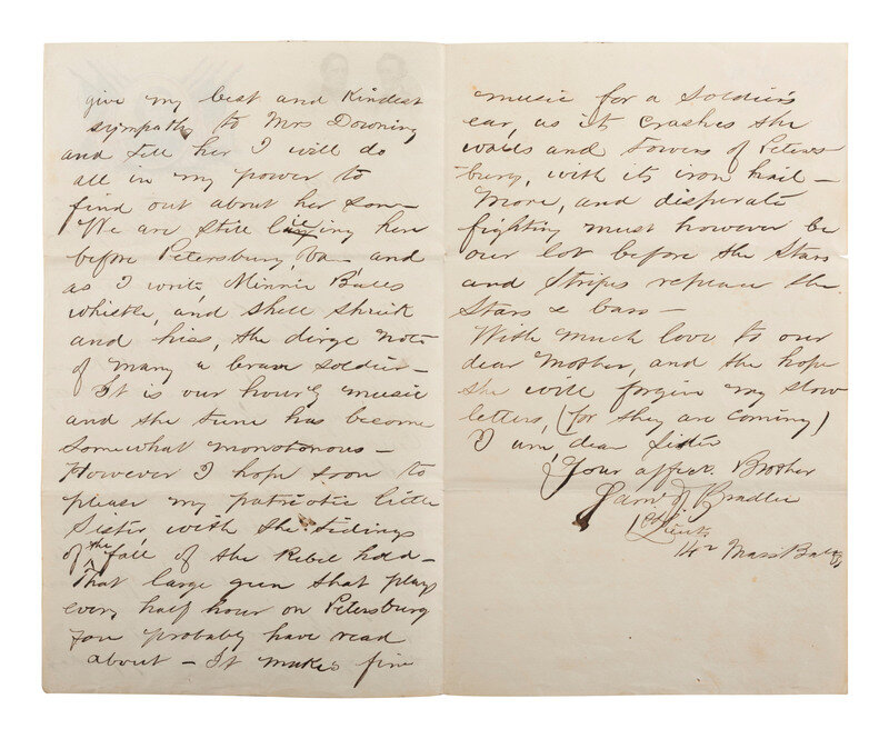 Bradlee writes regarding the fate of his friend and his situation at Petersburg: “I do not know what has become of George Downing, all I do know he was missing from the battery soon after the march to Coal or Cold Harbor. I think the Rebels have got him in Richmond – Tell his mother from me, not to be alarmed about him…give my best and kindest sympathy to Mrs. Downing and tell her I will do all in my power to find out about her son….” Bradlee goes on to describe his position before Petersburg, writing while “Minnie Balls whistle, and shells shriek and hiss” around him.