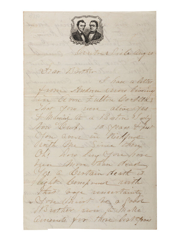 [With:] Letter on Lincoln-Hamlin campaign stationery, ca 1860, featuring at center a conjoined jugate image of Lincoln and Hamlin in shield. Milgram AL-94.