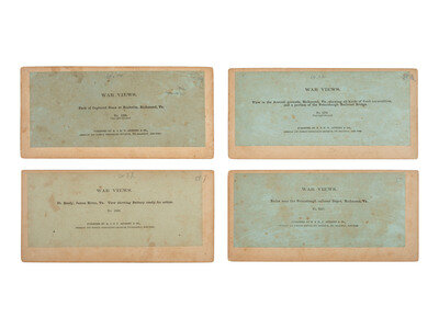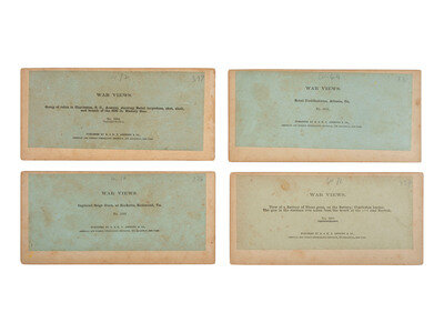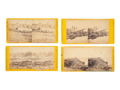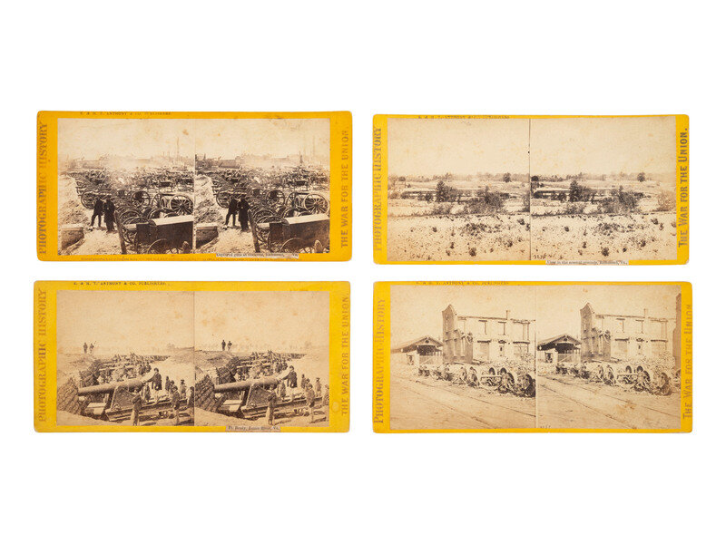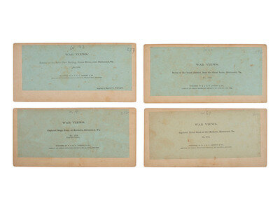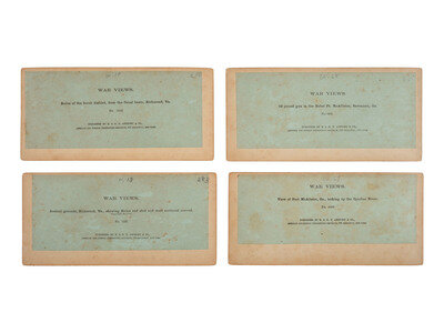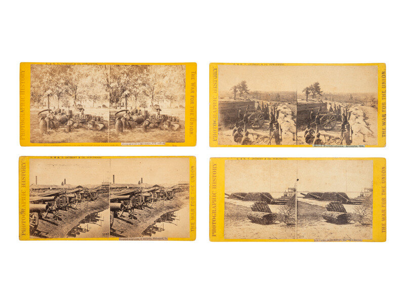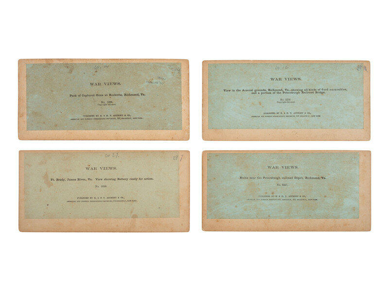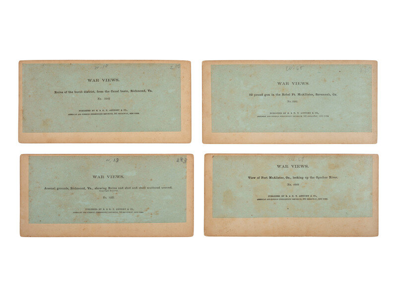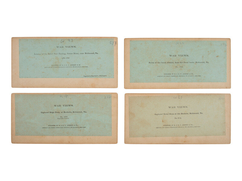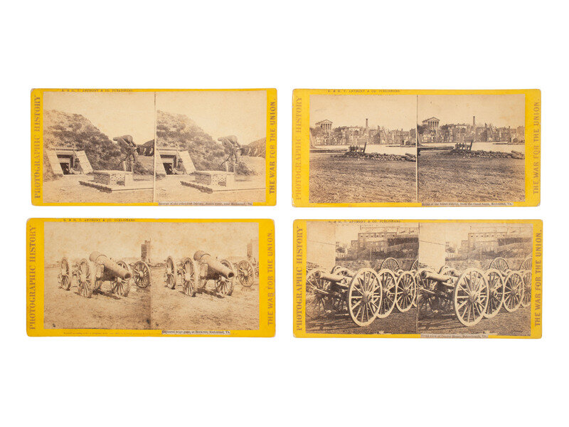 16 stereoviews published by E. & H. T. Anthony & Co., each bearing publisher's imprint to upper edge and series title "Photographic History / The War for the Union" to left and right of mount recto; and printed series labels affixed to versos including image numbers and titles. Titles include: Captured Siege Guns, at Rocketts, Richmond, Va. -- Ruins of the burnt district, from the Canal basin, Richmond, Va. -- Arsenal grounds, Richmond, Va., showing Ruins and shot and shell scattered around. -- View in the Arsenal grounds, Richmond, Va., showing all kinds of fixed ammunition, and a portion of the Petersburgh Railroad Bridge. -- Interior of the Rebel Fort Darling, James River, near Richmond, Va. -- Ft. Brady, James River, Va. View showing Battery ready for action. -- 32 pound gun in the Rebel Ft. McAllister, Savannah, Ga. --View of a Battery of Three guns, on the Battery, Charleston harbor. The gun in the distance was taken from the wreck of the iron clad Keokuk. -- Group of relics in Charleston, S. C., Arsenal, showing Rebel torpedoes, shot, shell, and breach of the 600 lb. Blakely Gun. -- And 7 more, including some duplications. -- Together, 16 views.