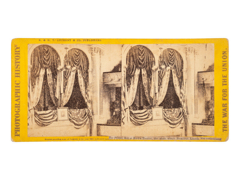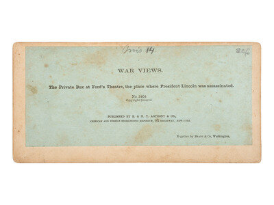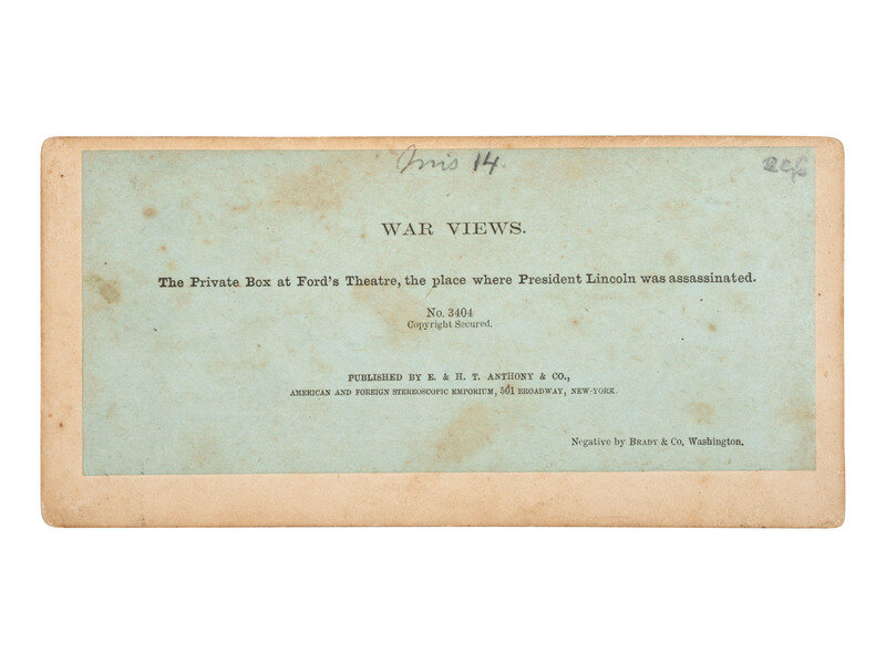 Stereoview on yellow mount with publisher's imprint along upper margin and copyright statement along lower margin (spotting, discoloration, soiling, and some wear to print; moutn with soiling and wear). Verso with affixed paper label featuring image number "3404," title "The Private Box at Ford's Theatre, the place where President Lincoln was assassinated," and negative credit to Brady & Co.