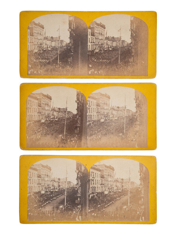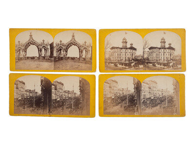 A rare view of the triple arch at 12th street, designed for the funeral by W. W. Boyington, and through which the hearse would pass as it entered the city. Uncredited, but attributed by consignor to Carbutt. A more popular view of this arch shows the hearse passing through it, accompanied by a procession of young ladies in white dresses. Here, a group of soldiers are visible behind the arch, likely waiting for the hearse to arrive. -- A view of the Cook County Court House decorated for the funeral. A group of people stand on the street corner nearest the camera, and in the distance, a large line of mourners can be seen filing into the court house entrance to view Lincoln's body. Faint pencil inscription on verso reads, "State House Chicago / Lincoln's funeral." -- And 5 views of Lake Street showing the funeral procession as it progresses westward toward Clark Street. All taken from the same (nearly identical) vantage point at the corner of Lake and Clark, but capturing different parts of the parade. -- Together, 7 stereoviews.