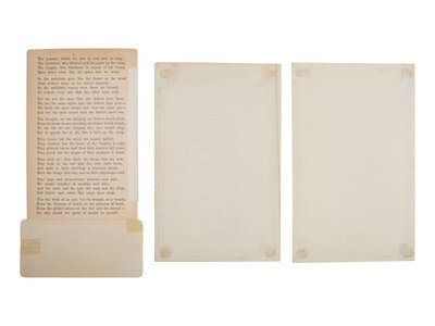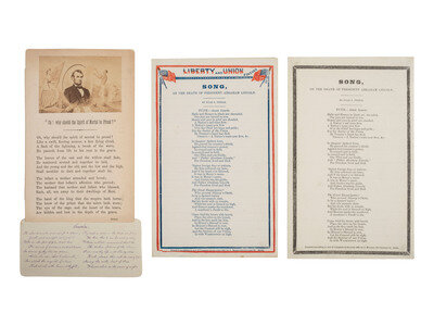 "Oh! Why should the spirit of the mortal be proud?" Poem by William Knox printed front/back on 7 x 4 3/8 in. cardstock, with 2 1/4 x 3 1/4 in. portrait of Lincoln mounted at top (toning, light soiling, tape on verso). With additional poem, which appears to be printed, affixed to bottom edge of cardstock (tape repairs on verso). The poem, entitled "Lincoln," was first written by William Cullen Bryant. -- Song on the Death of President Abraham Lincoln. By Silas S. Steele. Philadelphia: J. Magee. 1865. Song sheet, mourning the death of Lincoln, within black mourning border. 1p, 8 x 5 in., bifolium (very good, some residue on terminal leaf). -- Song on the Death of President Abraham Lincoln. By Silas S. Steele. Philadelphia: J. Magee. 1865. Song sheet, mourning the death of Lincoln, within red and blue border. Upper margin with "Liberty and Union Forever" flanked by American flags printed in red and blue. 1p, 8 x 5 in., bifolium (very good, light toning to margins, some residue on terminal leaf). -- Together, 3 imprints mourning the loss of Abraham Lincoln.