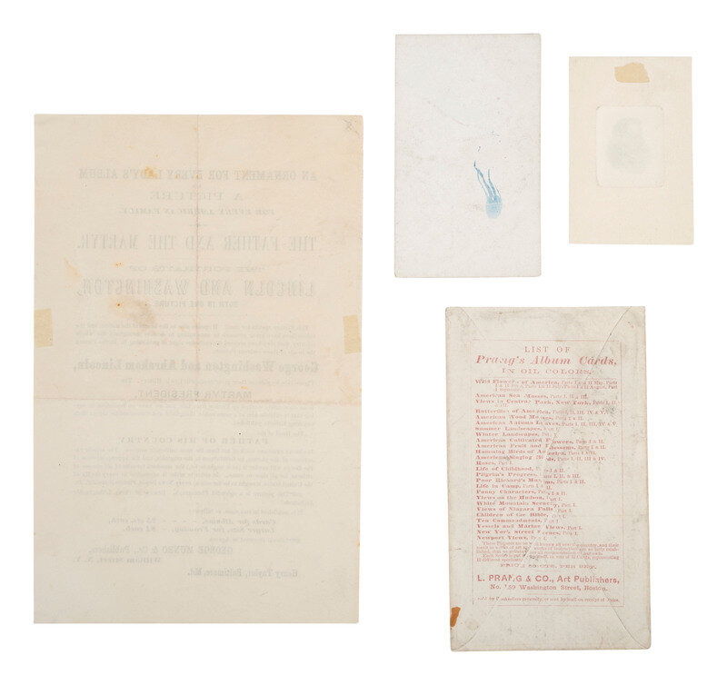An Ornament for Every Lady's Album and A Picture for Every American Family. The Father and the Martyr. The Portraits of Lincoln and Washington, Both in One Picture. William Street, NY: George Munro & Co., publishers. Signed in type by Henry Taylor, Baltimore, Md. 8 1/2 x 5 3/8 in. printed broadside advertising the portrait depicting George Washington and Abraham Lincoln together, published in two sizes, including "cards for albums" and "larger size, for framing" (light soiling, light folds, some edge wear). The seller notes, "This picture is a splendid Photograph. Beware of cheap Lithographic Imitations!"
