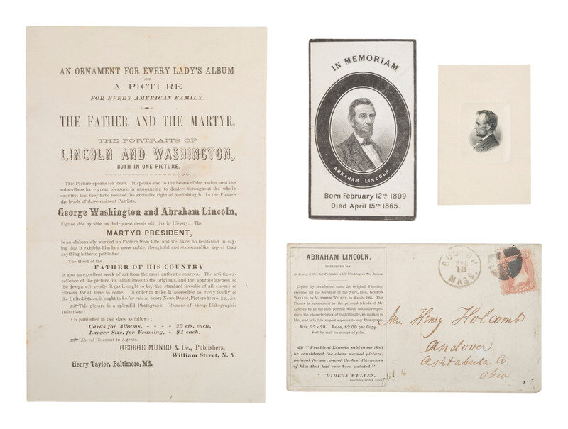 [With:] In Memoriam / Abraham Lincoln. 4 x 2 3/8 in. printed memorial card featuring a portrait of Lincoln at center, surrounded by a black mourning border, with Lincoln's birth and death dates in the lower margin (light soiling and edge wear). -- 3 x 2 in. printed portrait of Lincoln in profile (minor residue on verso). -- Postal cover with printed information on front promoting a portrait of Abraham Lincoln published by Prang & Co., Boston. With details about the portrait, which was "copied by permission from the Original Painting, executed for the Secretary of the Navy, Hon. Gideon Welles, by Matthew Wilson, in March 1865." A quote from Welles about the portrait is included at bottom. Reverse side of cover includes printed "List of Prang's Album Cards, in Oil Colors." Addressed to "Mr. Henry Holcomb, Andover, Ashtabula, Ohio," with "Boston, Mass. Dec. 13" postmark (soiling, edge and corner wear, sealed).