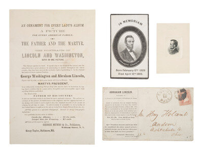 [LINCOLNIANA] 4 items incl. broadside promoting portrait of Lincoln and Washington and memorial card