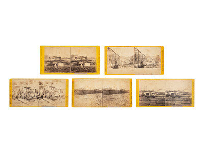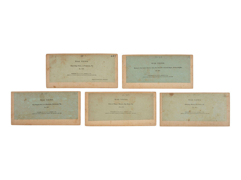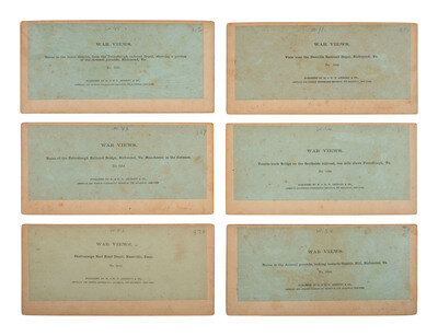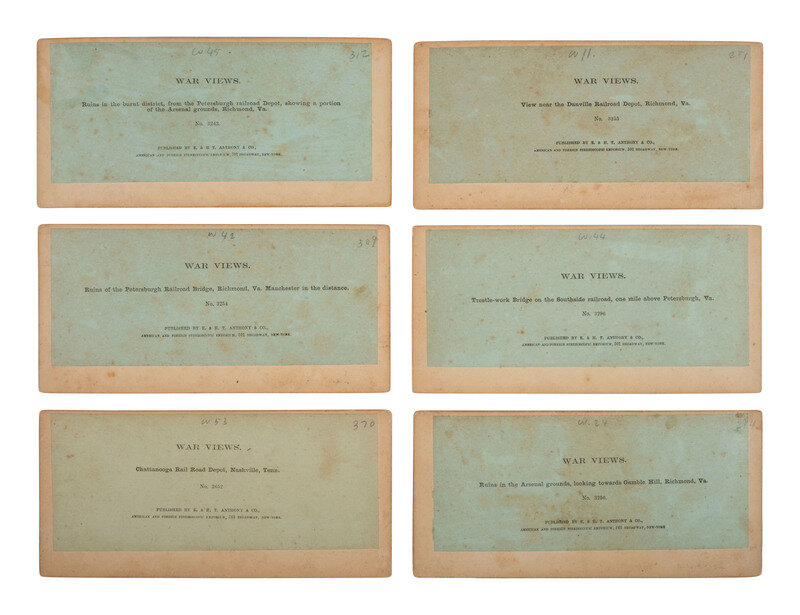 11 stereoviews published by E. & H. T. Anthony & Co., New York, each bearing publisher's imprint along upper edge and series title "Photographic History / The War for the Union" to left and right of mount recto; and printed series labels affixed to versos including image numbers and titles. Titles include: Ordnance Wharf, City Point, Va. -- Park of Wagon Wheels, City Point, Va. -- Ruins in the burnt district, from the Danville railroad Depot, Richmond, Va. -- Fire Engine No. 3, at Rocketts, Richmond, Va. -- Great Siege Train, at Yorktown, Va. -- Ruins in the Arsenal grounds, looking towards Gamble Hill, Richmond, Va. -- Trestle-work Bridge on the Southside railroad, one mile above Petersburgh, Va. -- View near the Danville Railroad Depot, Richmond, Va. -- Chattanooga Rail Road Depot, Nashville, Tenn. -- Ruins of the Petersburgh Railroad Bridge, Richmond, Va. Manchester in the distance. -- Ruins in the burnt district, from the Petersburgh railroad Depot, showing a portion of the Arsenal grounds, Richmond, Va. -- Together, 11 views.