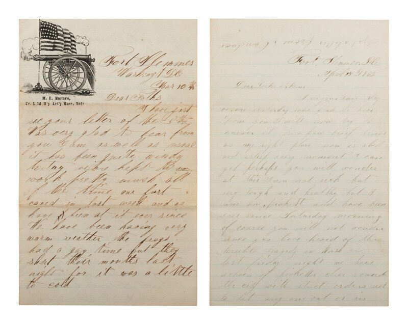 [With:] Another letter from Barnes, Fort Slemmer, Washington, D.C. 10 March [1865]. 4pp, 5 x 8 in. General news of his activities at the fort.