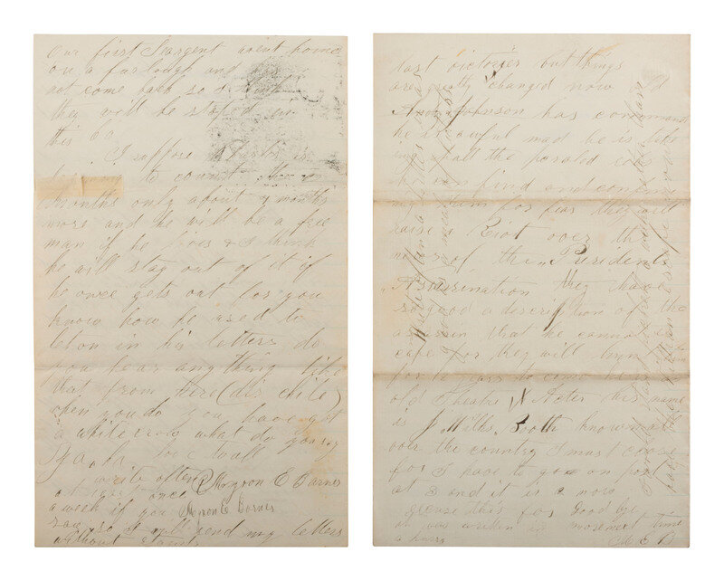 BARNES, Myron E. (1847-1865). Autograph letter signed ("MEB") while serving as a private in the 3rd Heavy Artillery Massachusetts Volunteers. "Fort Slemmer, DC," 18 April 1865. 4pp, 5 x 8 in. (light toning, creasing at folds).