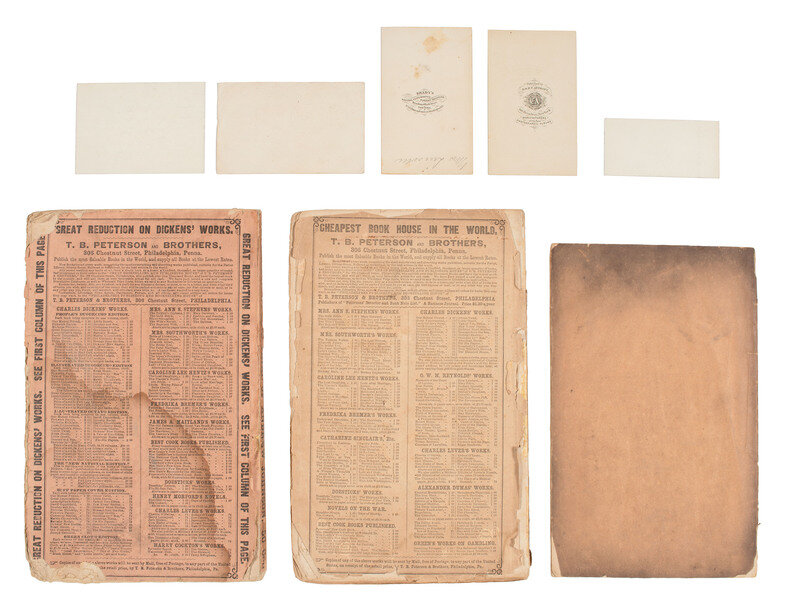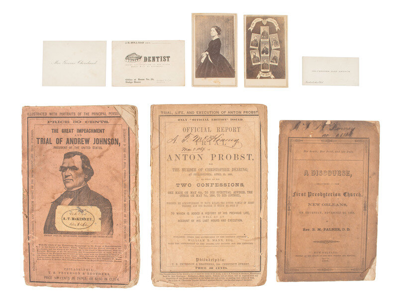 The Great Impeachment and Trial of Andrew Johnson, President of the United States. Philadelphia, PA: T.B. Peterson & Brothers, 1868. Paper label affixed to front cover identified to original owner, "A.T. McKinney," and dated 8 February 1869. (Paper wrappers heavily worn, including staining, loss. Spotting and soiling to text). -- CDV of Mary Todd Lincoln, after lithograph/engraving. New York: Brady. -- CDV, "Our Peace Commissioners for 1865," composite view featuring Lincoln at center surrounded by his generals. New York: E. & H.T. Anthony.