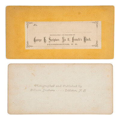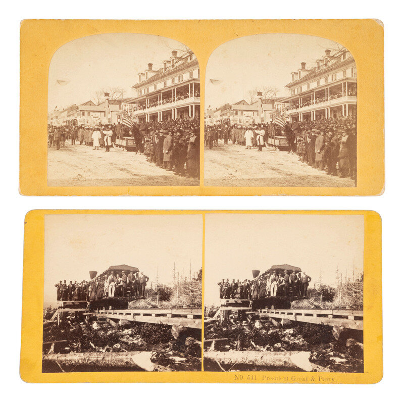 View of a train car with numerous people standing on and around it, titled on mount recto "No 541 President Grant & Party." Littleton, NH: Kilburn Brothers, ca 1868. -- View of a crowd of spectators in and in front of a hotel, watching a parade of uniformed men, some with instruments and banners, coming down the street. Peterborough, NH: George H. Scripture. Consignor's note describes this scene as being a Grant political rally for the election of 1868. While this cannot be confirmed, one of the banners does appear to feature Grant's name. -- Together, 2 stereoviews on yellow mounts. Each in fair condition.
