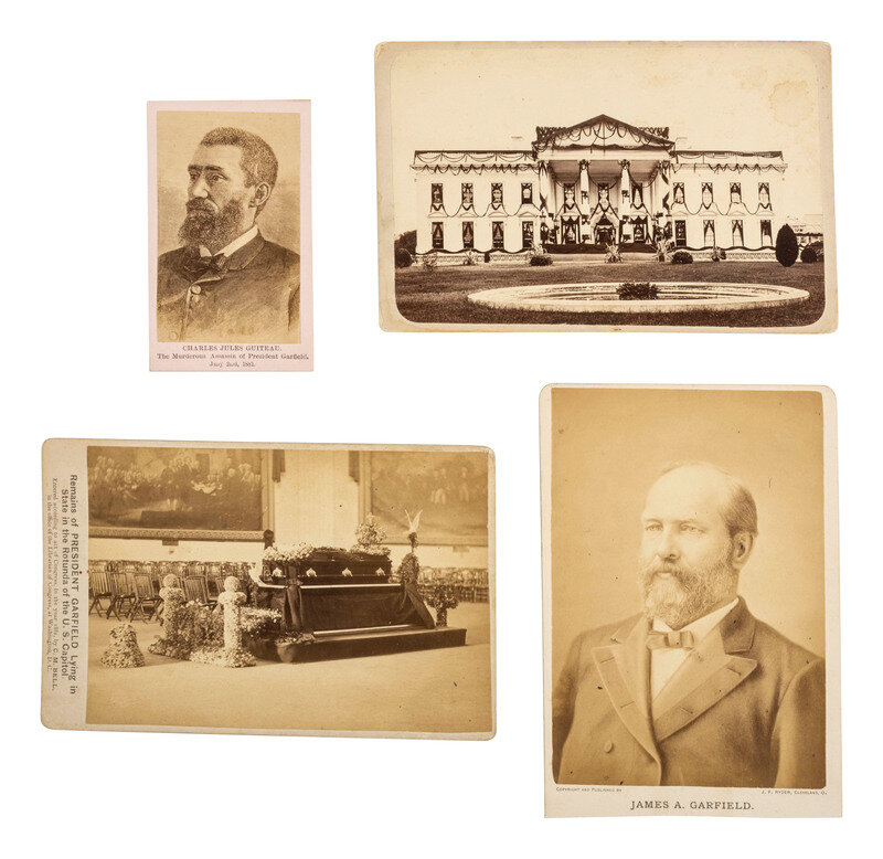 Cabinet card of the White House draped in mourning following the death of President James Garfield (light toning, some spotting and dampstaining, wear to edges). Uncredited, but with ink inscription on verso reading, "White House - North (in Main) Front." -- Cabinet card bust portrait of James A. Garfield (toning, spotting, wear to edges). Cleveland, OH: J. F. Ryder. Photographer's faint pictorial imprint on verso. -- Cabinet card featuring the casket holding the "Remains of President Garfield Lying in State in the Rotunda of the U. S. Capitol" (toning, soiling, wear to edges). Washington, DC: C. M. Bell, 1881. -- CDV engraved portrait of Charles Jules Guiteau "The Murderous Assassin of President Garfield. July 2nd, 1881" (light toning, wear). Uncredited. -- Together, 4 images.