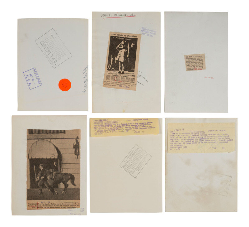 Highlighted scenes include: John F. Kennedy conferring with his aides, including his brothers Ted and Robert. 22 July 1960. -- Crowd watching President-elect Kennedy arriving at the White House, 6 December 1960. -- John F. Kennedy and Jacqueline holding John F. Kennedy, Jr., following his christening, 8 December 1960. -- John F. Kennedy riding in the inaugural parade, 20 January 1961. -- Jacqueline, John Jr., and Caroline boarding a jet for a trip to Palm Beach, 26 January 1962. -- "Mrs. John F. Kennedy, accompanied by CBS News Correspondent Charles Collingwood, will show the principal rooms of the White House, commenting on the changes that have been made..." 14 February 1962. -- John F. Kennedy with a scale model of the Mariner II, 17 January 1963. -- John F. Kennedy, Jr., crawling on the floor of his father's office, 28 May 1962. -- Caroline Kennedy horseback riding at the White House, 21 March 1962. -- Jacqueline, Robert, and Ted Kennedy heading John F. Kennedy's funeral procession, printed 1973. -- "Last Salute to President," composite scene featuring John F. Kennedy, Jr., saluting his father's casket, printed one year after John F. Kennedy was assassinated, 22 November 1964. -- And 2 others.