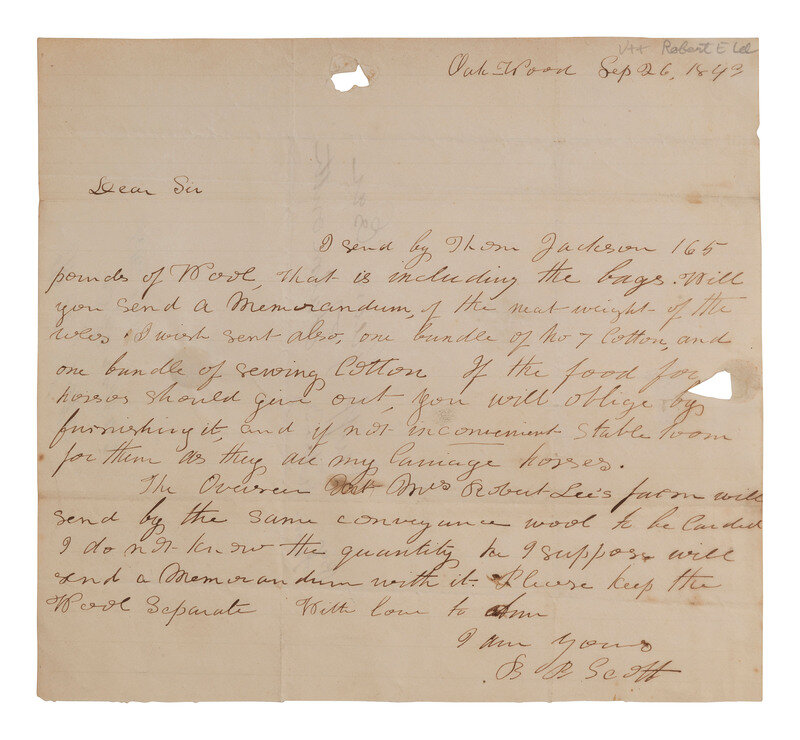 [ENSLAVEMENT]. Letter mentioning the "overseer at Mrs. Robert Lee's farm." Oakwood, [VA] 1843.