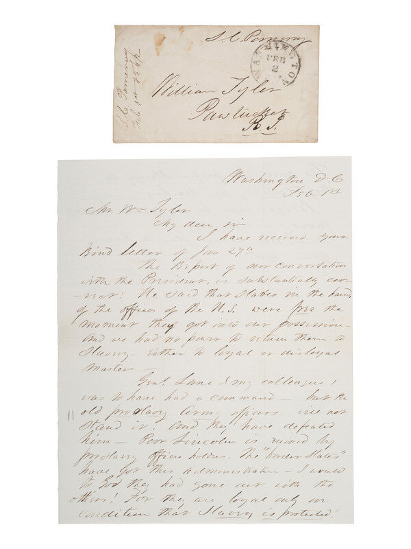 [ENSLAVEMENT]. POMEROY, Samuel C. (1816-1891). Autograph letter signed ("S.C. Pomeroy"), as US Senator, regarding a conversation with Lincoln about "slaves in the hands of the offices of the U.S." Washington, D.C., 1 February [1862].