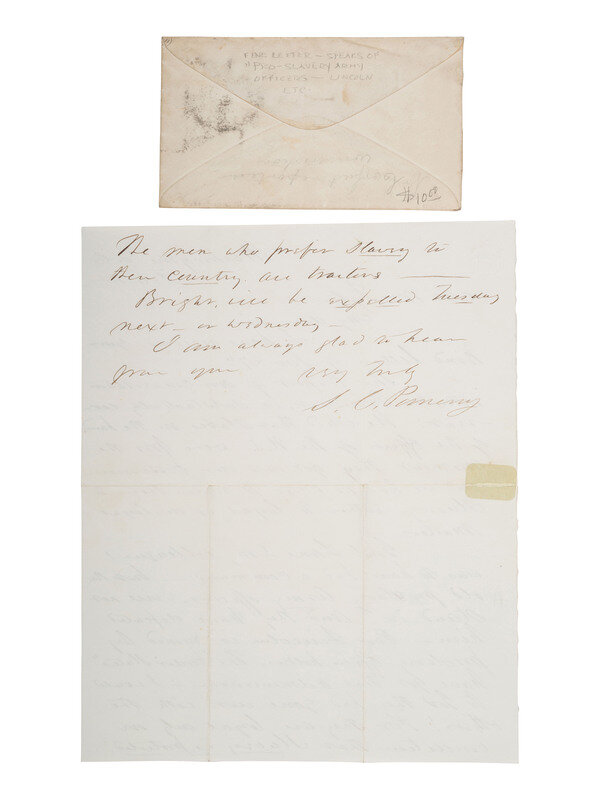 Samuel C. Pomeroy was born in Massachusetts and attended Amherst College. He became a strong opponent of slavery and helped New Englanders who opposed slavery move into Kansas Territory through the New England Emigrant Aid Company in 1854. Having helped found and settle the city of Lawrence, Kansas, he was elected as a federal senator by that state in 1861. It is in that capacity that he wrote the letter featured in this lot.