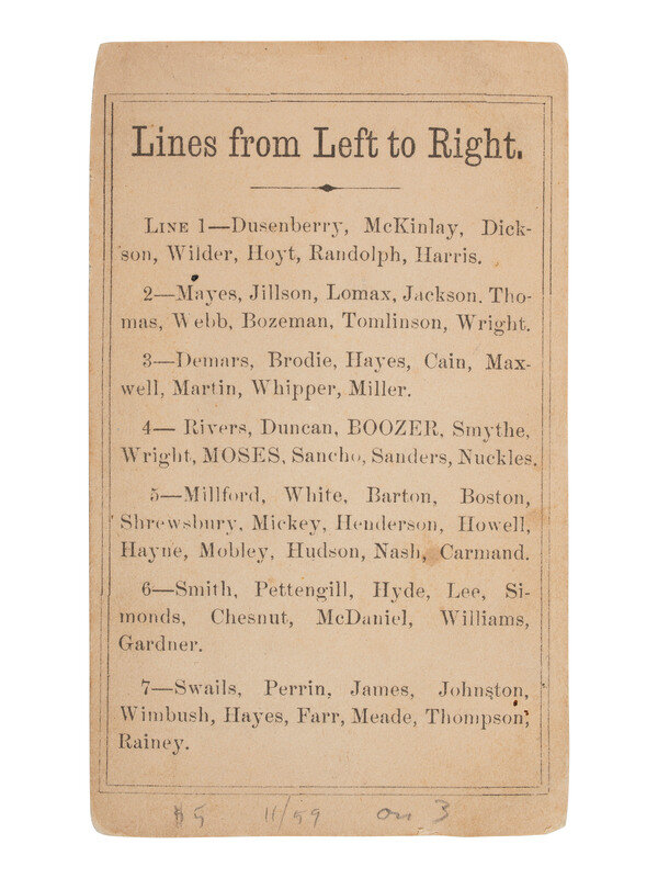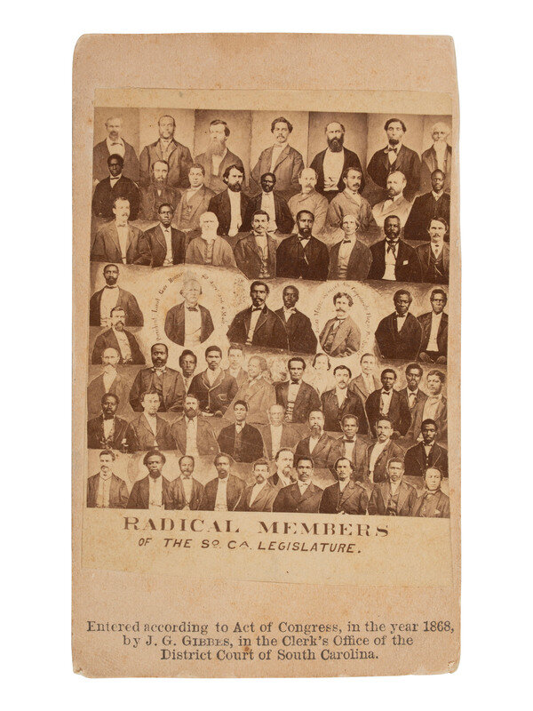 Purposed to incite fear and inflame anti-black sentiment among white Americans, some versions of this carte include printed statistics on mount recto (not featured here), including the majority ratio of "negroes or mulattoes" to white legislators, numbers of the men who could read and write, and the number of pictured legislators who did not pay taxes. Though the claims were untrue, they contributed to the anti-Black sentiments that were already alive and well in South Carolina, as evidenced, in part, by the prominence and rampant activity of the Ku Klux Klan in the state during Reconstruction.