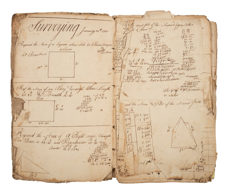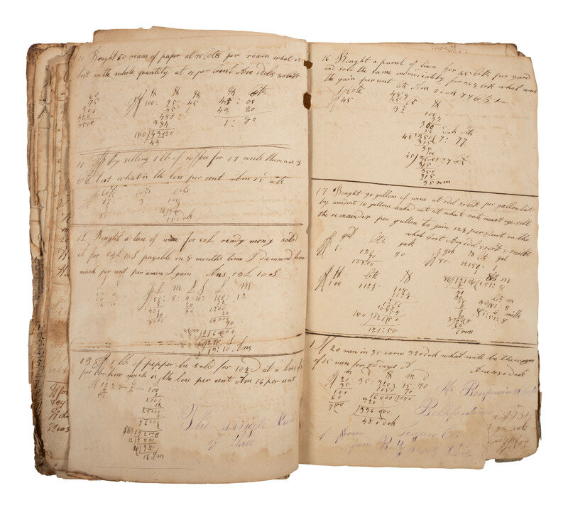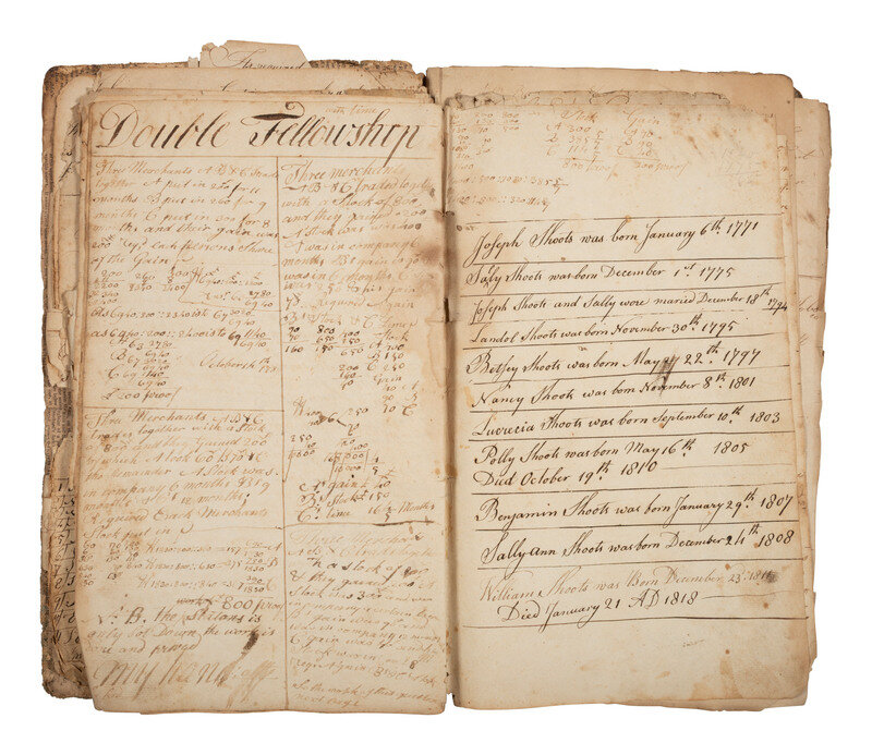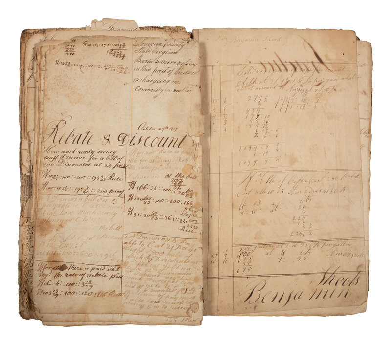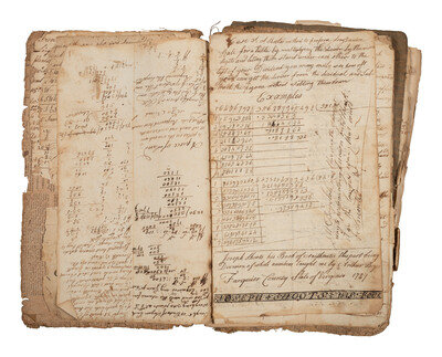 Multiple names are inscribed within the notebooks, but the earliest entries seem to be the work of Joseph Shoots (1771-1855), then later at least one but perhaps multiple of his children have made additions. One inscription reads: "Joseph Shoots his Book of Arithmetic this part being Division of whole numbers taught me by Arthur Boys Farquier County State of Virginia 1787."