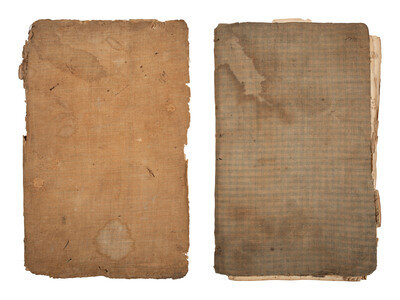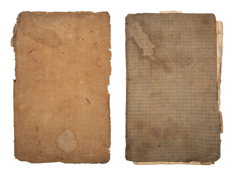 Two books, each approx. 8 1/4 x 13 in., with hand-sewn newspaper-backed cloth wraps, approx. 92pp and approx. 62pp respectively (heavy wear to both books, including to covers and some pages, generally legible). Manuscript entries primarily constitute arithmetic lessons, but additional manuscript notes list family names, birth dates, and other identifying information.
