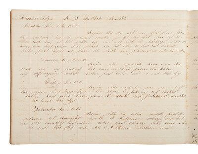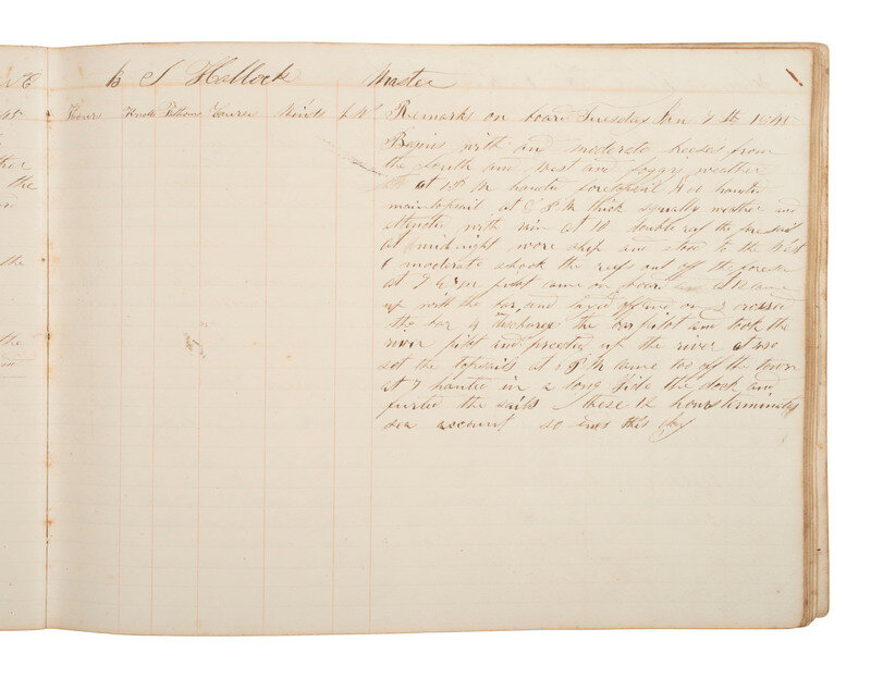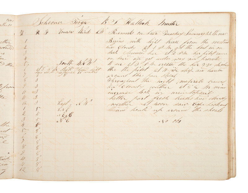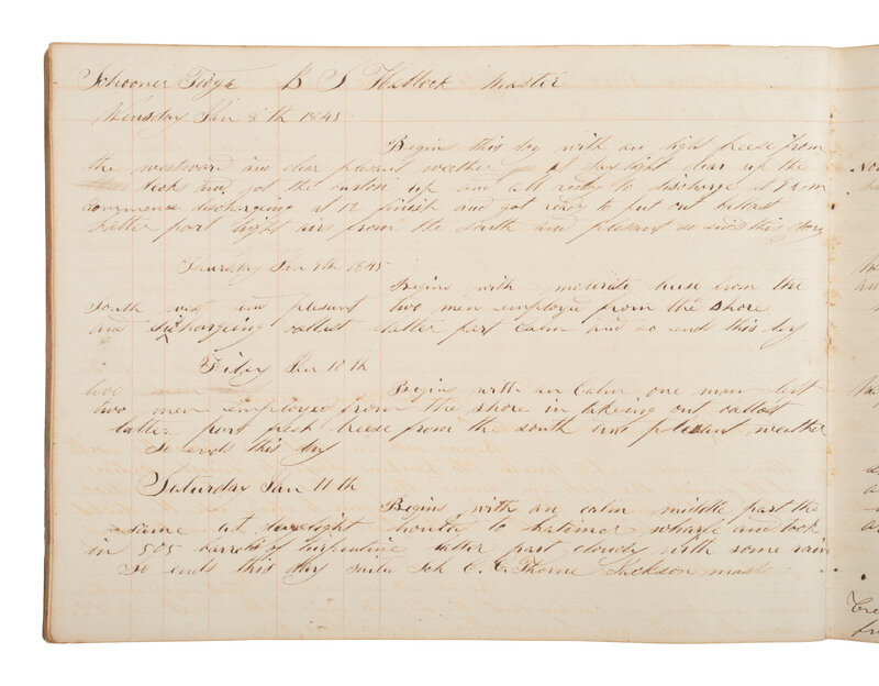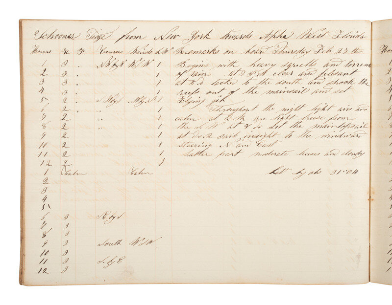 10 x 7 1/2 in. log book with paper boards, 80pp (toning, light soil, wear to spine but pages still intact). Identified on verso of front board "Schooner Tioga Log Book / New York." October 1844 - March 1845. Documents roundtrip voyages from New York City to Wilmington, NC, and New York City to Appalachiola, West Florida under the command of Master Benjamin S. Hallock.