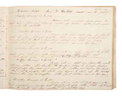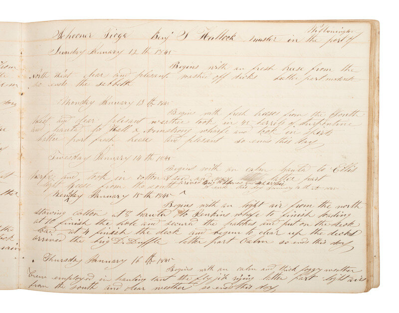 Log book records expected data including reports of wind, weather, and ship direction, as well as noting arrival at ports, loading of various types of cargo, work on the ship, etc. Sample entry: (from the port of Wilmington) "Monday January 13th 1845 / Begins with fresh breeses from the South West and clear plesant weather took in 45 barrels of turpentine and hauled to Hall & Armstrong wharfe and took in spirits Latter part breese and plesant so ends this day."
