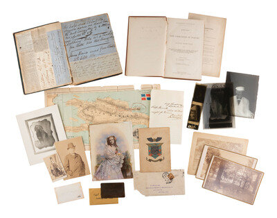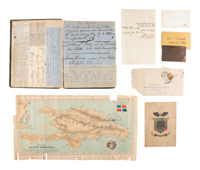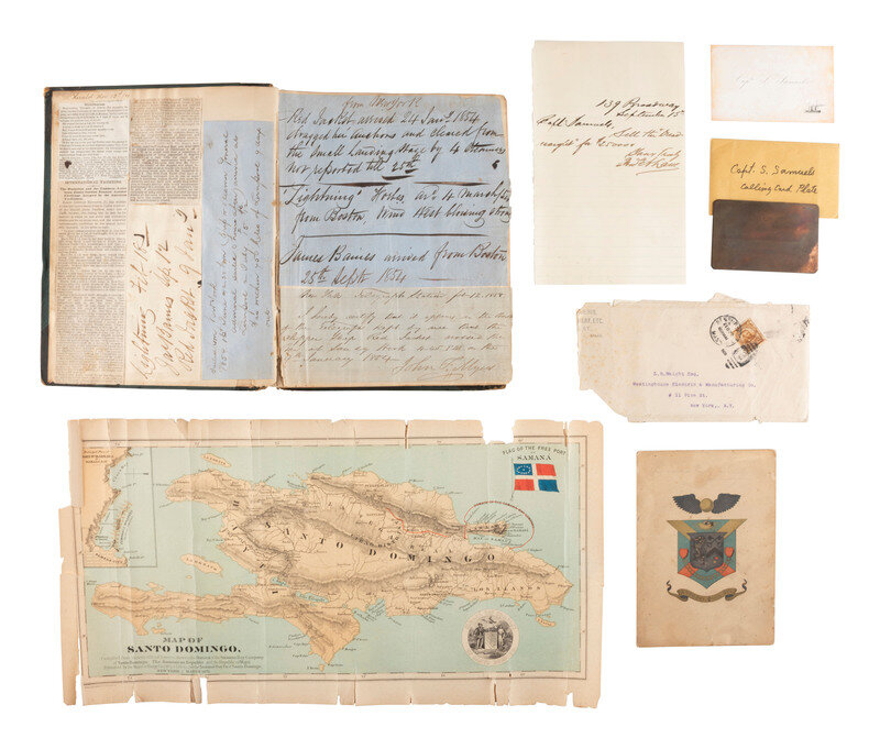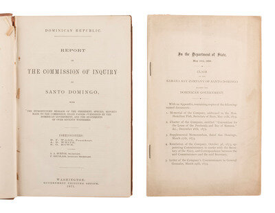 [Also with:] Color "Map of Santo Domingo, compiled from various official Sources, showing the Domain of the Samana Bay Company...." New York: March 1873 (rolled, heavy wear, losses, creasing). -- "Dominican Republic. Report of The Commission of Inquiry to Santo Domingo, with the Introduction Message of the President...." Washington: Government Printing Office, 1871. Inscribed "With compliments of / Col. John Hay / To / Capt S. Samuels."-- Staple-bound pamphlet, "In the department of State, May 11th, 1889. Claim of the Samana Bay Company of Santo Domingo Against the Dominican Government." 48pp, with various reprinted documents identifying Samuels as a party to proceedings of the Samana Bay Company.