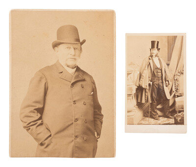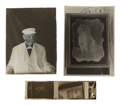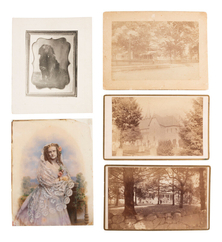[With:] Photographs, including: undated CDV standing portrait of a sophisticated and dapper gentleman, identified in modern blue ink on verso as "Capt Samuels," with backmark of Charles D. Fredericks & Co. of New York. -- An undated cabinet card of an older gentleman in coat and hat, identified in modern blue ink on verso as "Capt Samuels," with backmark of Fredericks' Knickerbocker Family Portrait Gallery. -- Hand-painted portrait on milk glass identified on verso on modern label "Capt Samuels first wife." -- A glass plate negative housed in manilla sleeve identified as "Capt Samuels." -- A contemporary copy photograph identified in pencil on verso as "'Wallace' / copied from a Daguerre-o-type of dog in picture of the 'Dreadnought.'" -- Several miscellaneous cabinet cards featuring outdoor views and negatives.